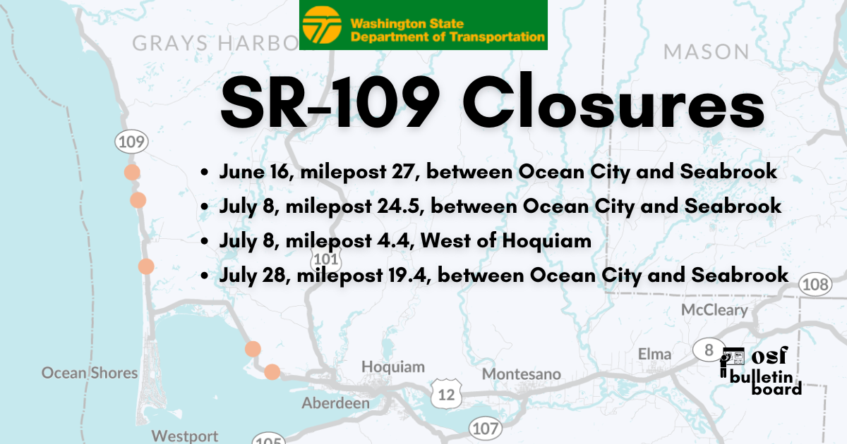 Starting July 8 at 12:01 a.m., SR 109 at milepost 24.5 will close between Alderwood Lane and Park Lane for approximately 28 days.